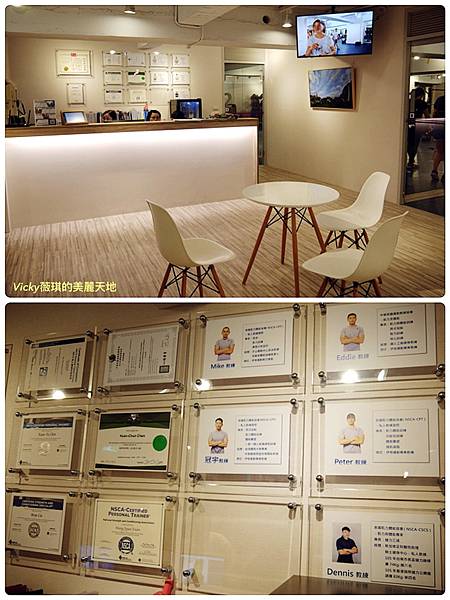 牆壁上有貼著美國肌力體能協會(NSCA)認證的教練群