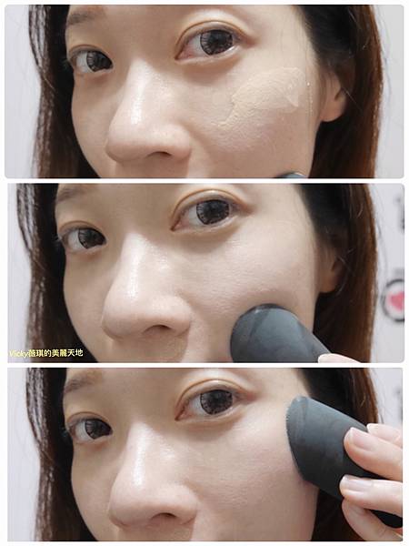 用手塗的感覺比較厚實;海綿上妝則是薄透