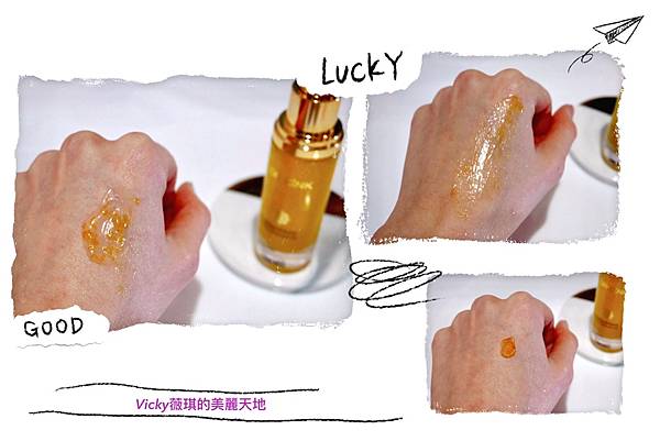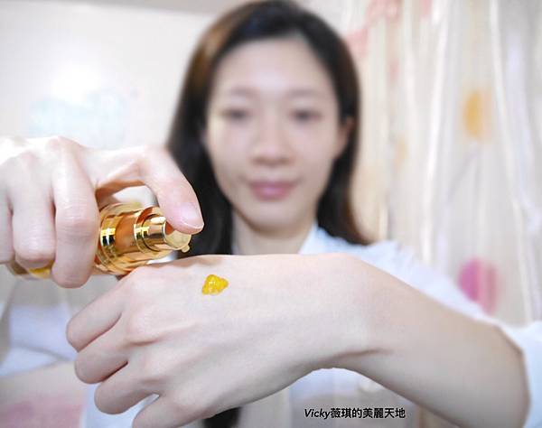 質地:透明精華液夾伴著一顆顆的黃金珍珠微導晶球,塗抹時立即化開~