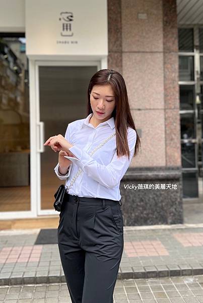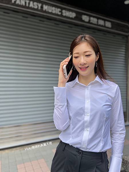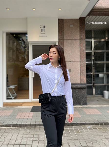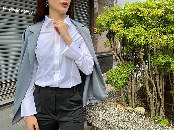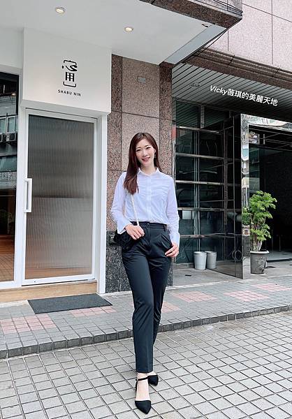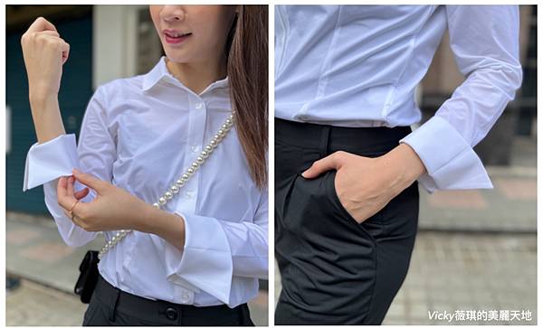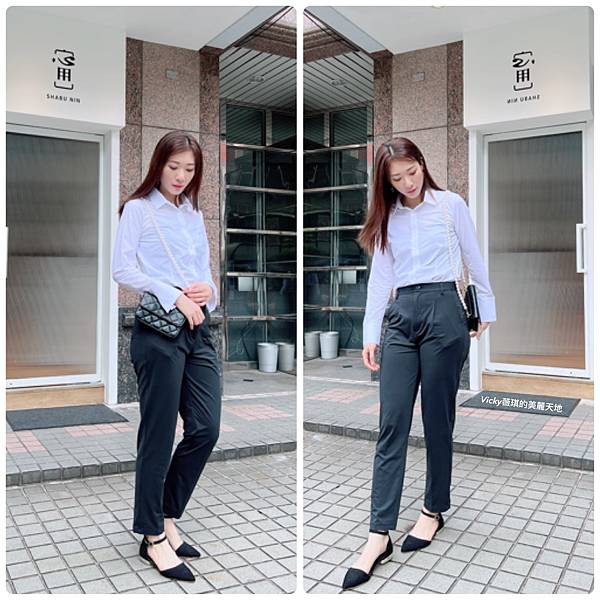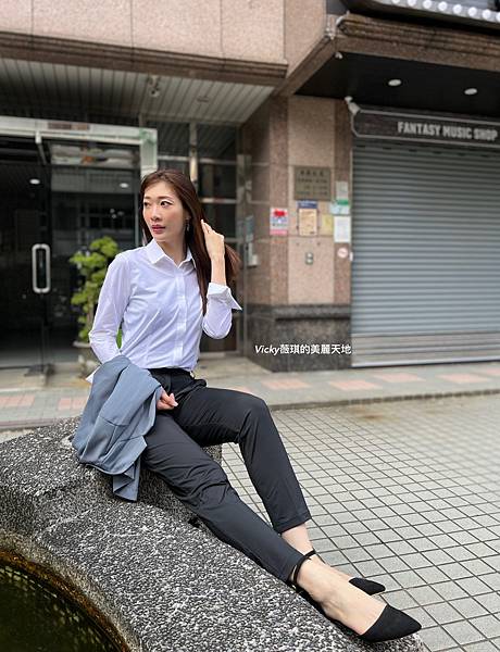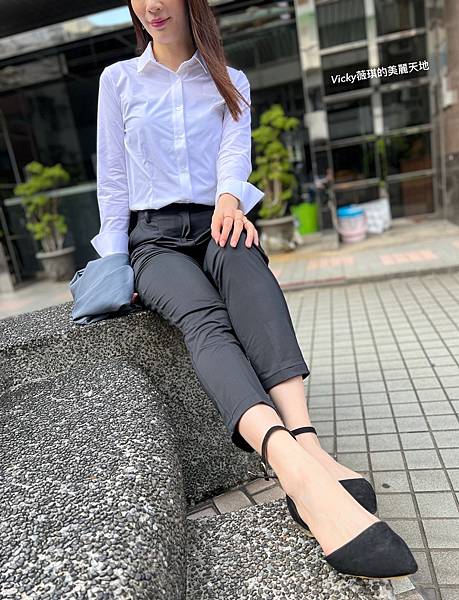 折袖款彈性襯衫(白) + 正裝長褲(黑)