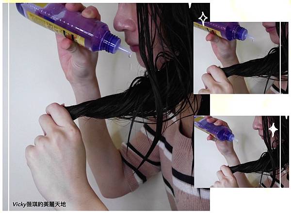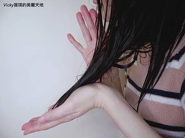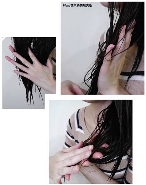 步驟一:擠,洗完頭髮後,直接將水髮膜擠在中段後的髮絲上