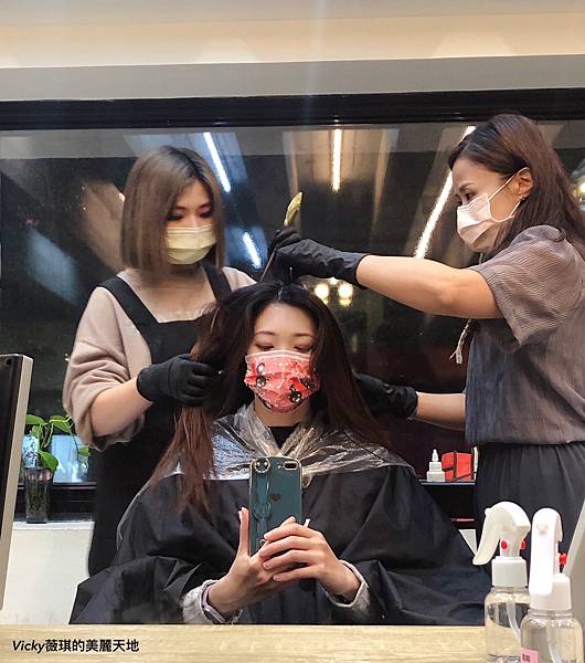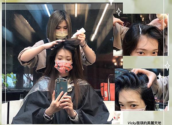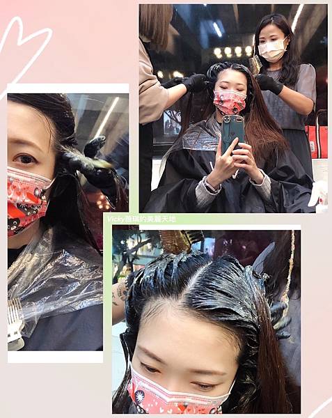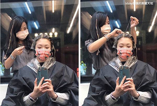 看著設計師和助理很仔細地將染膏刷在髮絲上