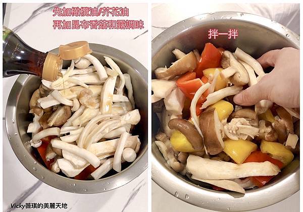 先淋上橄欖油/芥花油,再加入昆布香菇和露調味