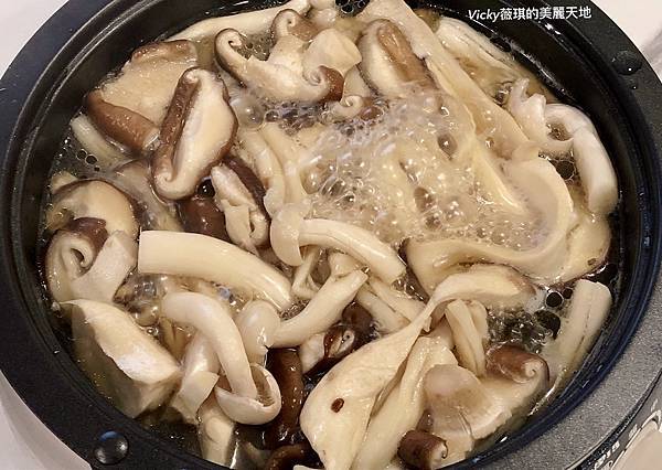 直接下全部的菇類,淋入鰹魚和露之後滾煮5分鐘